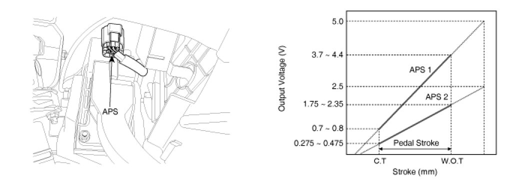 Accelerator Position Sensor (APS) is installed on the accelerator pedal module and detects the rotation angle of the accelerator pedal. The APS is one of the most important sensors in engine control system, so it consists of the two sensors which adapt individual sensor power and ground line. The second sensor monitors the first sensor and its output voltage is half of the first one. If the ratio of the sensor 1 and 2 is out of the range (approximately 1/2), the diagnostic system judges that it is abnormal.