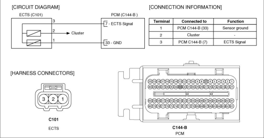Engine Coolant Temperature Sensor (ECTS) is located in the engine coolant passage of the cylinder head for detecting the engine coolant temperature. The ECTS uses a thermistor whose resistance changes with the temperature. The electrical resistance of the ECTS decreases as the temperature increases, and increases as the temperature decreases. The reference 5 V in the PCM is supplied to the ECTS via a resistor in the PCM.That is, the resistor in the PCM and the thermistor in the ECTS are connected in series. When the resistance value of the thermistor in the ECTS changes according to the engine coolant temperature, the output voltage also changes. During cold engine operation the PCM increases the fuel injection duration and controls the ignition timing using the information of engine coolant temperature to avoid engine stalling and improve drivability.