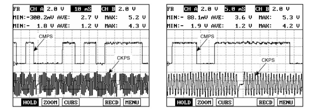 Crankshaft Position Sensor (CKPS) detects the crankshaft position and is one of the most important sensors of the engine control system. If there is no CKPS signal input, fuel is not supplied and the main relay does not operate. That is, vehicle can't run without CKPS signal. This sensor is installed on transaxle housing and generates alternating current by magnetic flux field which is made by the sensor and the target wheel when engine runs. The magnetic flux increases when the protrusion of the target wheel is getting near to the sensor and does not change in the most close position. When the protrusion becomes estranged from the sensor, magnetic flux disappears and alternating current is generated. The target wheel consists of 58 slots and 2 missing slots on 360 CA (Crank Angle).
