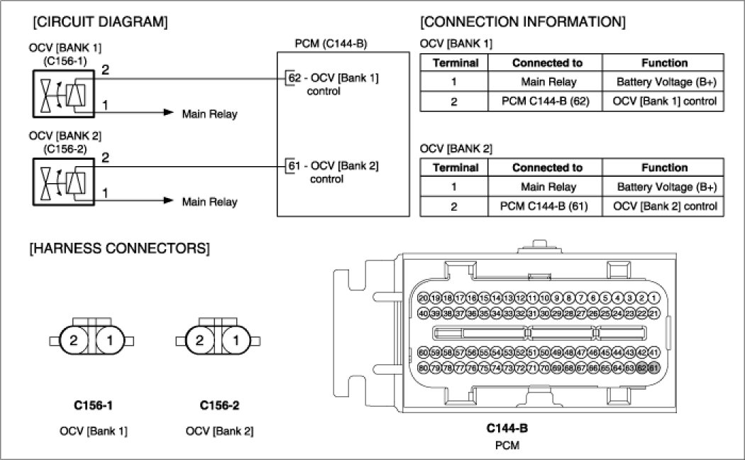 Continuously Variable Valve Timing (CVVT) system controls valve overlap with forcibly activating the camshaft and adjusts EGR (Exhaust Gas Recirculation) amount. It decreases exhaust gas (NOx, HC) and improves fuel economy, idle state, torque in low speed and power in high speed. This system uses engine oil pressure and consists of the two CVVT Oil Control Valves (OCV) in each bank which supplies oil to cam phaser according to PWM (Pulse Width Modulator) signal of the PCM, a CVVT Oil Temperature Sensor (OTS) which detects the oil temperature and a cam phaser which is installed on the end of the camshaft and converts camshaft phase. The oil getting out of the CVVT oil control valve flows into the cam phaser and rotates the rotor inside cam phaser. At this time, the camshaft rotates with the rotor and the cam phase is changed.