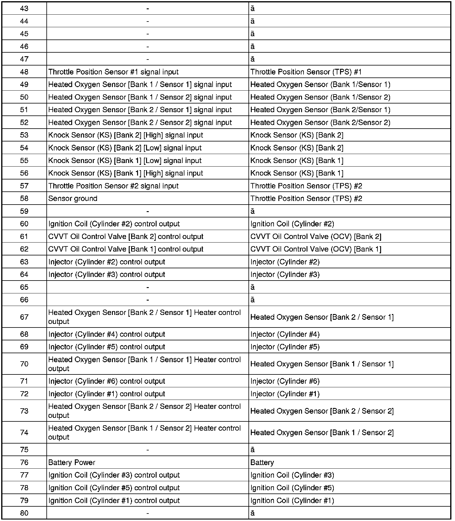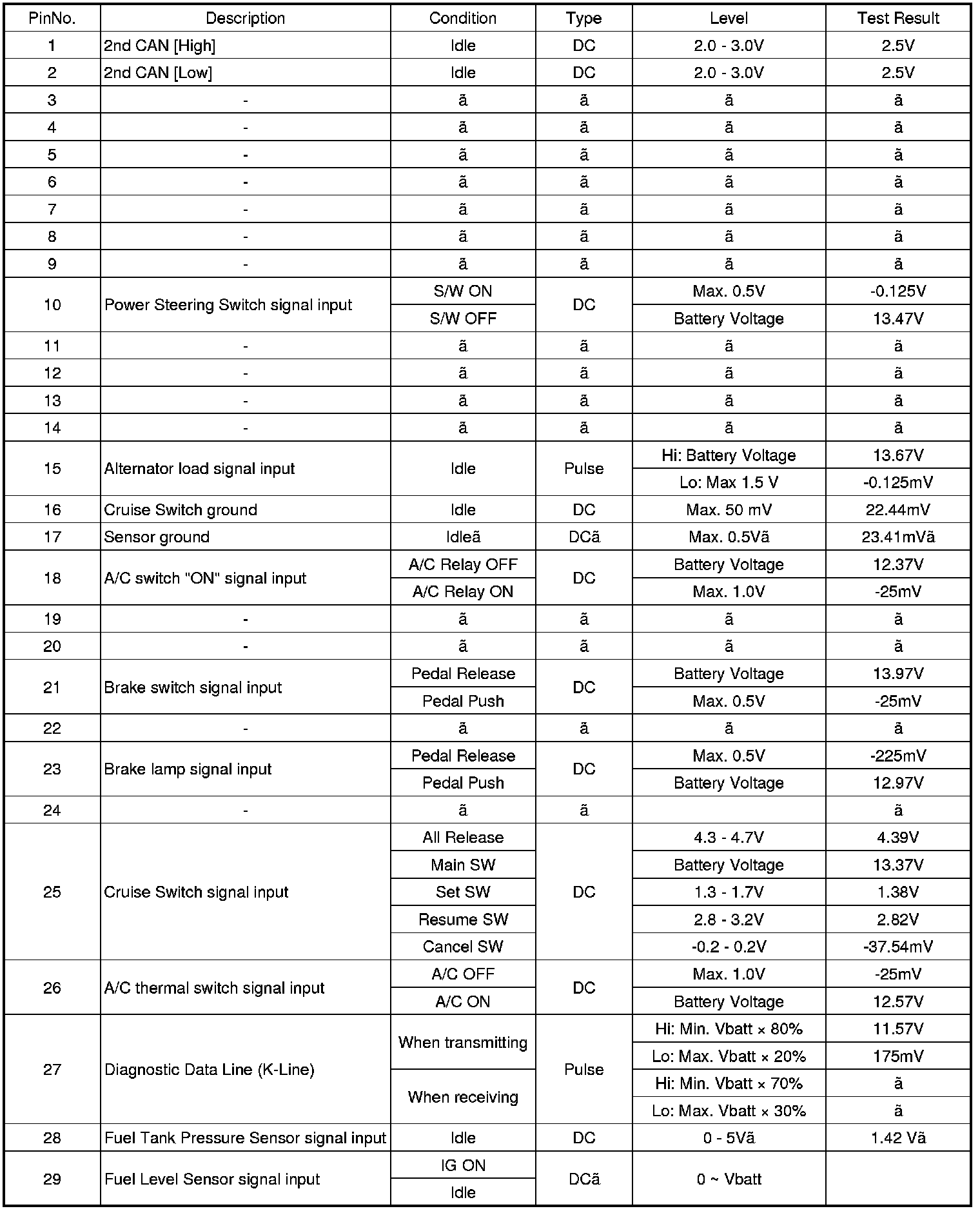 Pinout Values and Diagnostic Parameters