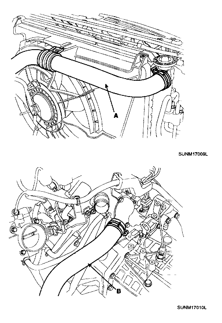 5. Disconnect the radiator upper hose(A) and the lower hose(B).