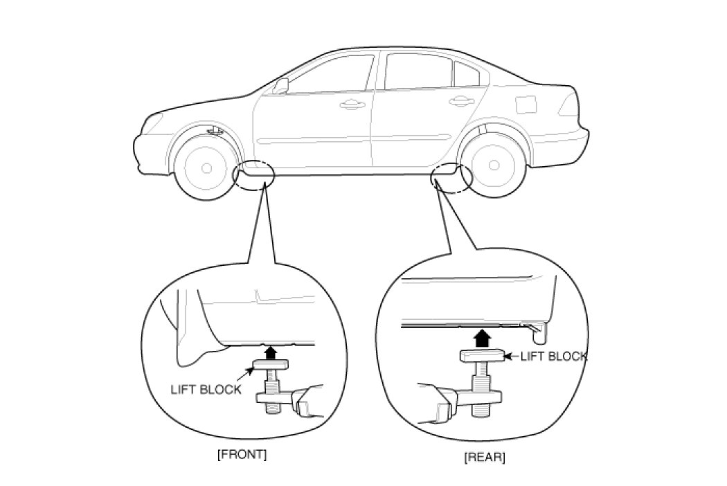 When heavy rear components such as suspension, fuel tank, spare tire, tailgate and trunk lid are to be removed, place additional weight in the luggage area before hoisting. When substantial weight is removed from the rear of the vehicle, the center of gravity may change and can cause the vehicle to tip forward on the hoist.