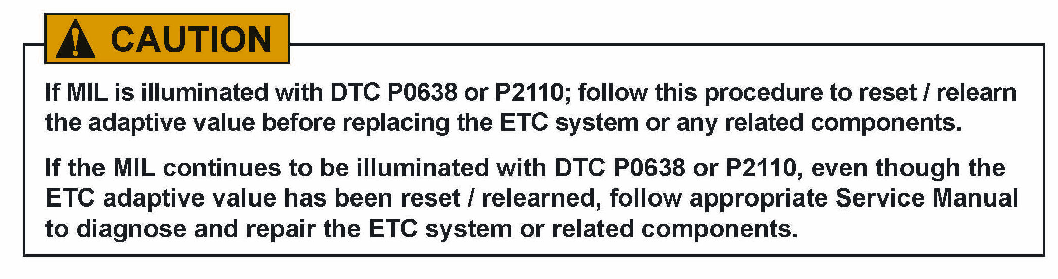 After the following repairs have been completed, the ETC adaptive value must be reset / relearned. If starting engine without resetting / relearning the ETC adaptive values; DTCs P0638 or P2110 will be stored in the ECM memory, and the MIL will be illuminated.
