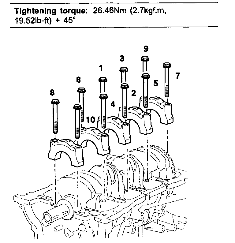 Retighten the bearing cap bolts by 45° in the numerical order shown.