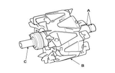 2. Check that there is no continuity between the slip rings and the rotor (B) or rotor shaft (C).