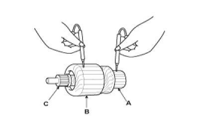 8. Check with an ohmmeter that no continuity exists between the commutator (A) and armature coil core (B), and between the commutator and armature shaft (C). If continuity exists, replace the armature.