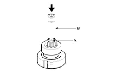 Using a suitable pulling tool (A), pull the overrunning clutch stop ring (B) over the stopper (C).