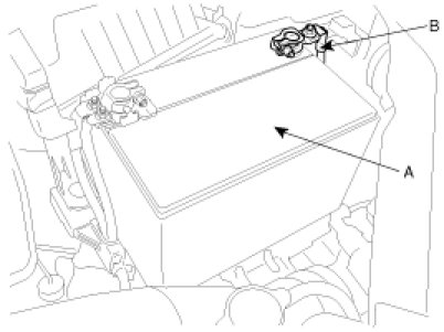 21. After installing the battery(A), connect the positive terminal(B) to the battery.