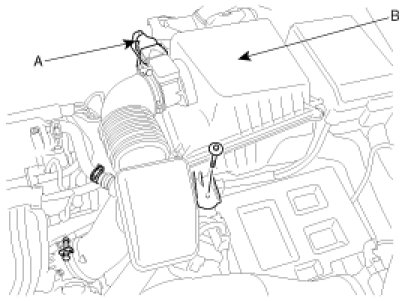20. Reassemble the air cleaner filter, install the air cleaner upper body(B) and connect the air flow sensor connector(A).