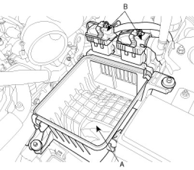 19. Install the air cleaner under body(A) and connect the PCM connectors(B).