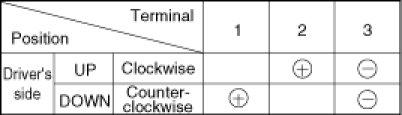 3. Connect the motor terminals directly to battery voltage (12V) and check that the motor operates smoothly. Next, reverse the polarity and check that the motor operates smoothly in the reverse direction. If the operation is abnormal, replace the motor.