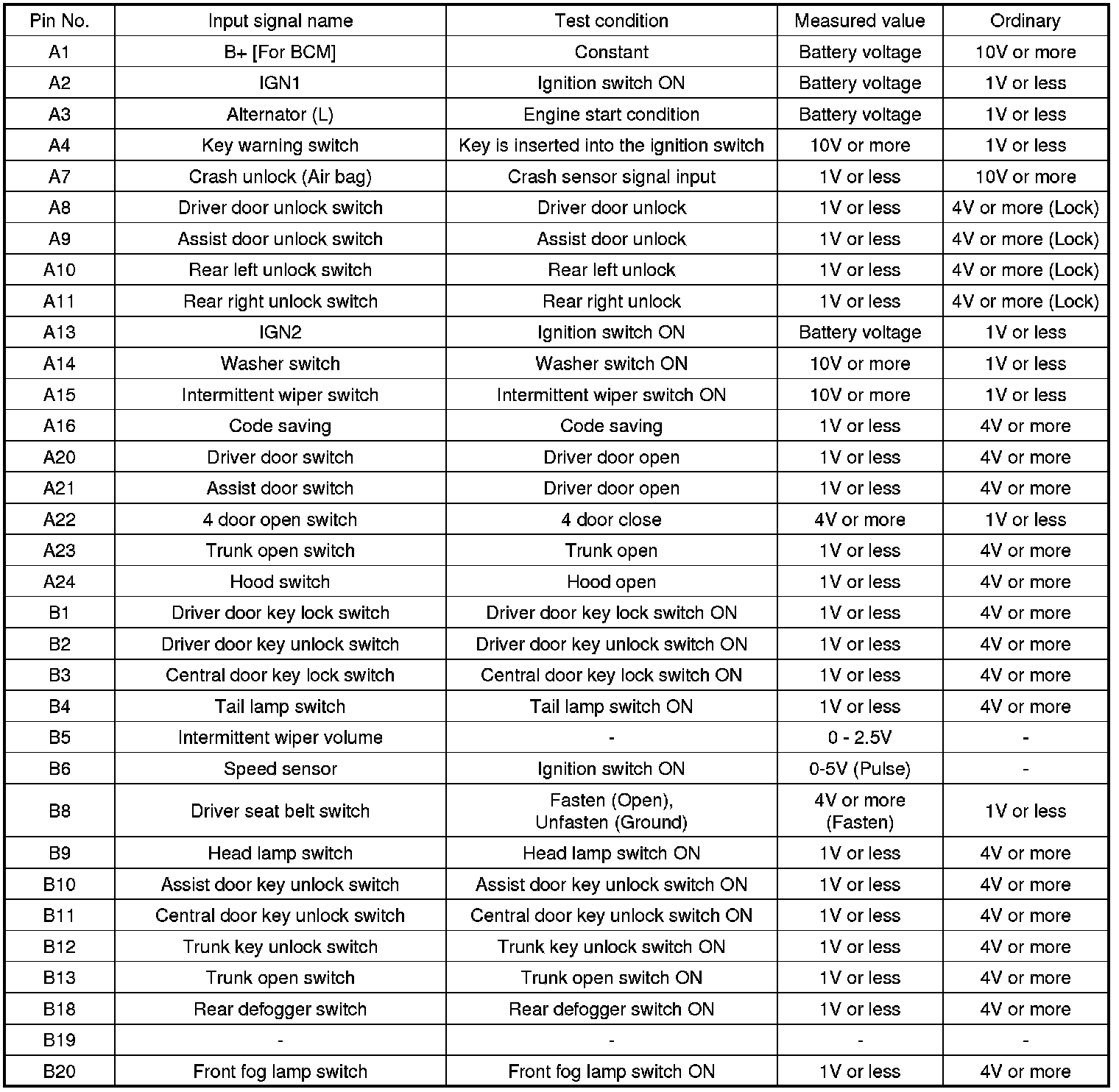 Pinout Values and Diagnostic Parameters