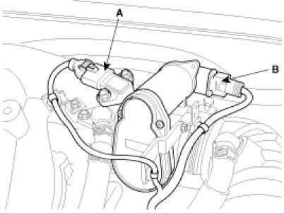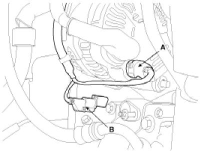 (6) Disconnect the generator connector(A) and the air conditioning compressor connector(B).