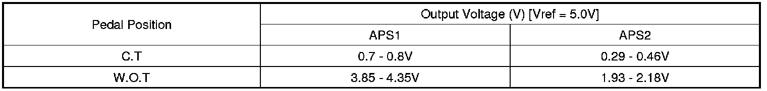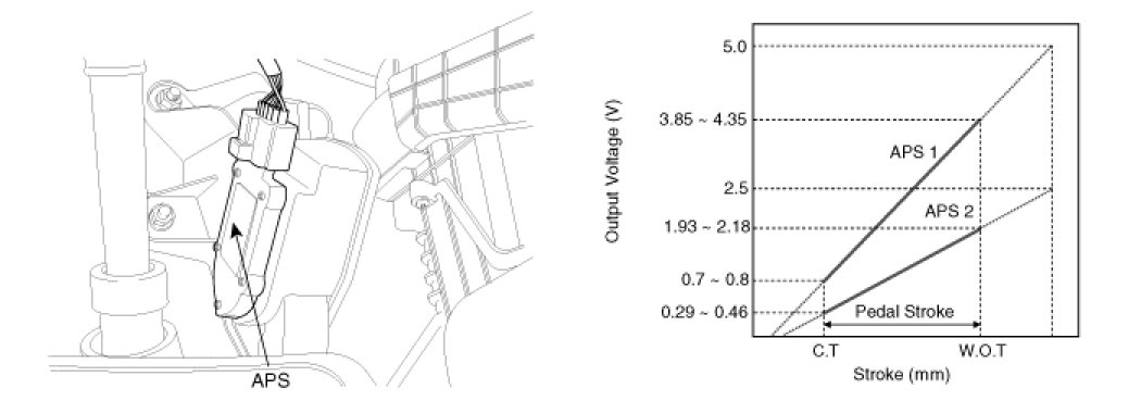 Accelerator Position Sensor (APS) is installed on the accelerator pedal module and detects the rotation angle of the accelerator pedal. The APS is one of the most important sensors in engine control system, so it consists of the two sensors which adapt individual sensor power and ground line. The second sensor monitors the first sensor and its output voltage is half of the first one. If the ratio of the sensor 1 and 2 is out of the range (approximately 1/2), the diagnostic system judges that a malfunction has occurred.