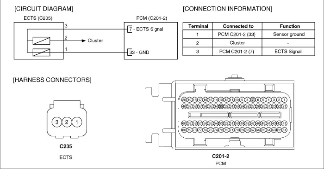 Engine Coolant Temperature Sensor (ECTS) is located in the engine coolant passage of the cylinder head for detecting the engine coolant temperature. The ECTS uses a thermistor whose resistance changes with the temperature. The electrical resistance of the ECTS decreases as the temperature increases, and increases as the temperature decreases. The reference 5 V in the PCM is supplied to the ECTS via a resistor in the PCM.That is, the resistor in the PCM and the thermistor in the ECTS are connected in series. When the resistance value of the thermistor in the ECTS changes according to the engine coolant temperature, the output voltage also changes. During cold engine operation the PCM increases the fuel injection duration and controls the ignition timing using the information of engine coolant temperature to avoid engine stalling and improve drivability.
