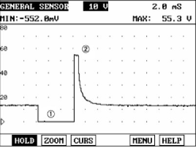(3) Monitor the CCV signal waveform and verify that the ground voltage is less than approx. 0.3V (1) and the surge voltage (2) is between 40 V and 60 V.