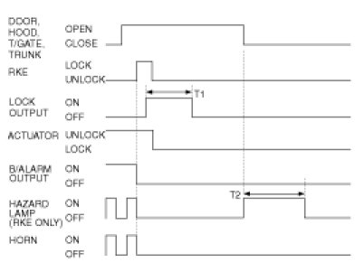 (1) ARM state is released (DISARM state) and the horn, the hazard output and the B/Alarm output shall be OFF, and the unlock output shall be ON for T1, and hazard lamp output shall be ON twice with cycle of T2(RKE only).