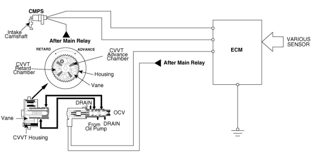 The CVVT changes the phase of the intake camshaft via oil pressure.