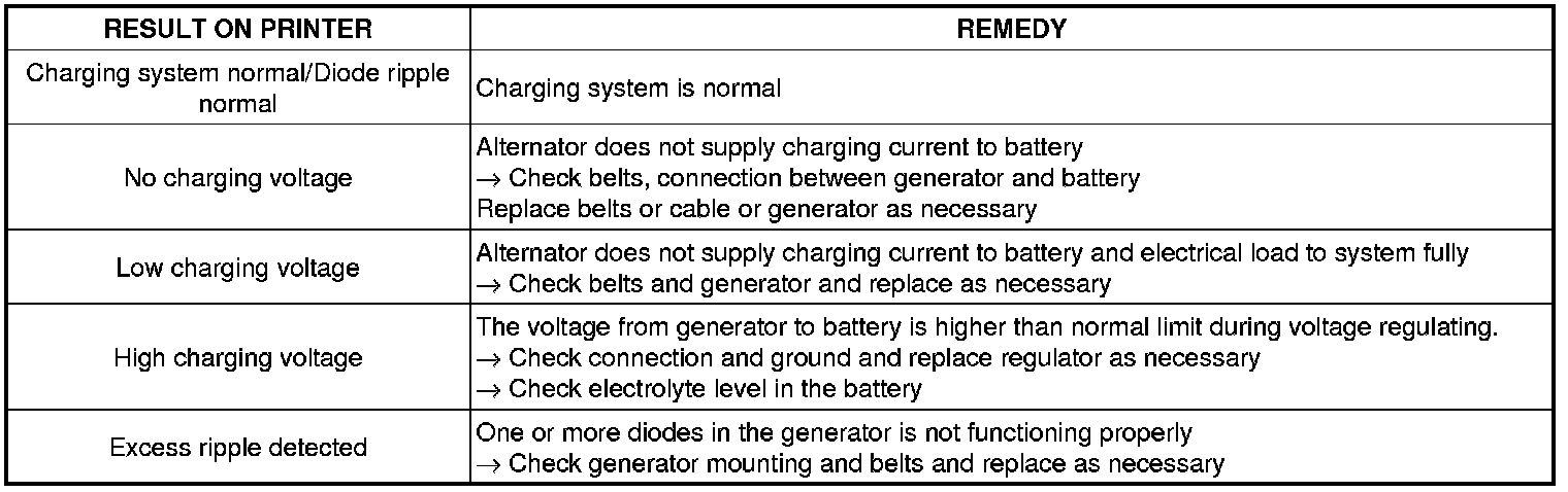 6. Take a relevant action according to the test results by referring to the table below after shutting off the engine and disconnect the tester clamps from the battery.