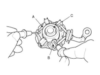 1. Check that there is no continuity between the (+) brush holder (A) and (-) brush holder (B). If there is no continuity, replace the brush holder assembly.