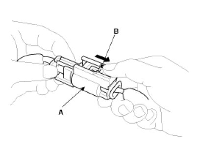 To release the lock, pull the spring-loaded sleeve (A) and the slider (B), while holding the opposite half of the connector. Pull the connector halves apart. Be sure to pull on the sleeve and not on the connector half.