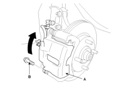 5. Pivot the caliper down into position. Being careful not to damage the pin boot, install the guide rod bolt (B) and torque it to proper specification.
