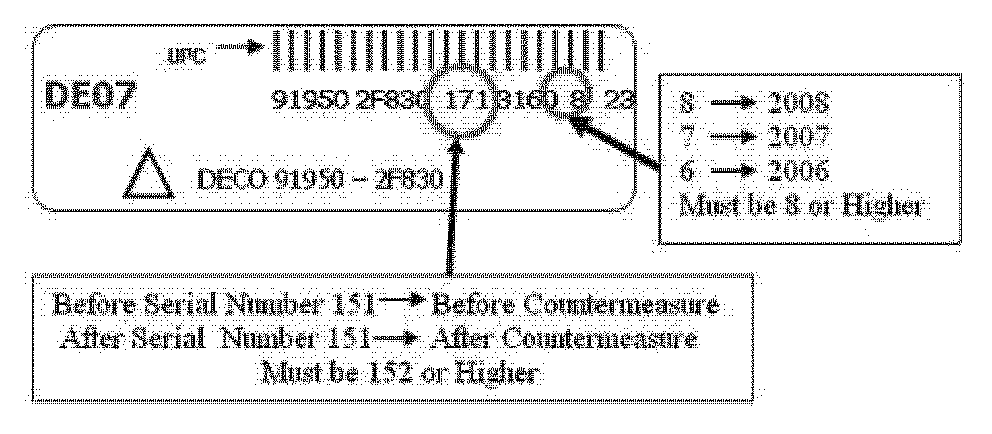 The Body Control Module (BCM) logic has been improved to correct this concern as of 8/8/2008. If a BCM has been replaced on the vehicle prior to this date, even if it was P/N 91950 2F830, the BCM will still require replacement with the newest level part. Locate the label shown below which is affixed to the BCM. Compare the first 3 numbers in the lot number and the third to last digit for the year to determine weather the BCM was manufactured before or after countermeasure.