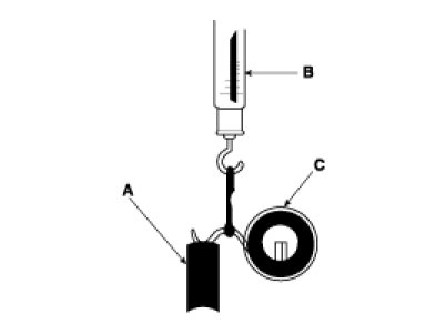 2. Insert the brush (A) into the brush holder, and bring the brush into contact with the commutator, then attach a spring scale (B) to the spring (C). Measure the spring tension at the moment the spring lifts off the brush.