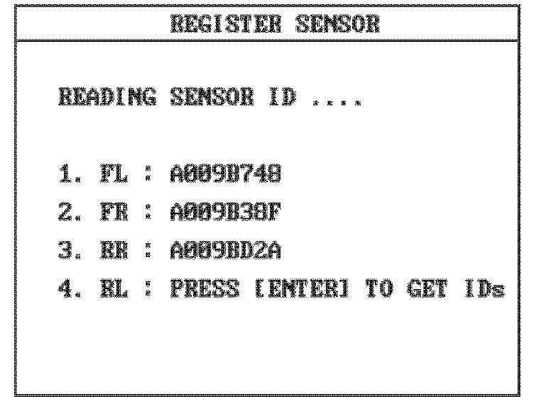 The WHEEL SENSOR ID screen is used as an alternate method to configuring sensor ID's. The primary method is to use the REGISTER SENSOR function.
