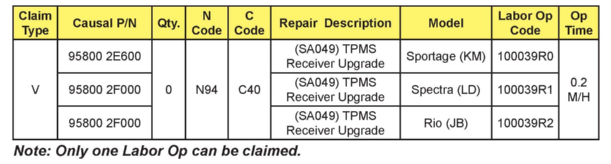 KMA is conducting a Service Action in relation to some 2008MY Sportage (KM), Spectra (LD), Rio (JB) vehicles with "low-line" Tire Pressure Monitoring System (TPMS). See Production Date Range Chart. Some vehicles may experience illumination of the TPMS warning lamp indicating that there is a problem with the TPMS system. This bulletin provides information relating to Tire Pressure Monitoring System (TPMS) receiver software upgrade for these vehicles. The upgrade procedure as outlined below will correct this condition.