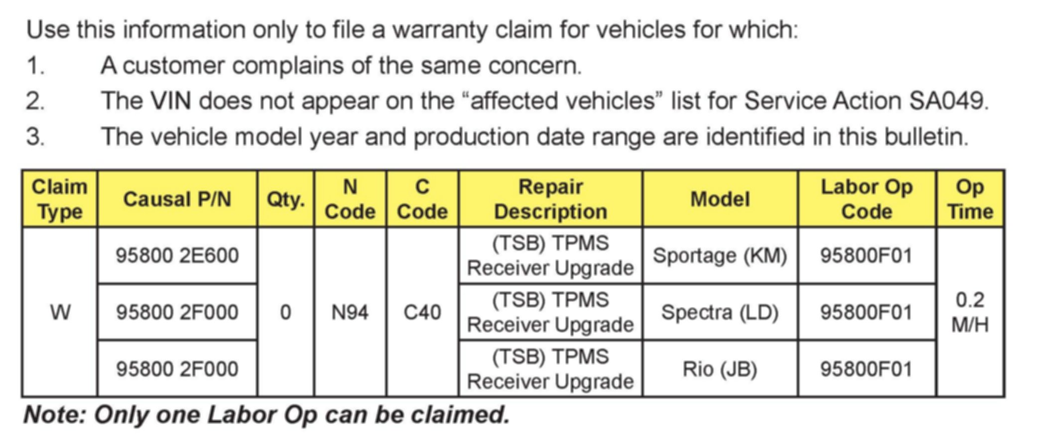 VIN inquiry data for this repair is provided for tracking purposes only. Kia retailers should reference SA049 when accessing the WebDCS system.