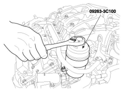3. Wait for 5 minutes after loosening the oil filter cap by turning it counterclockwise with SST(09263-3C100) to drain well the oil in the oil filter.