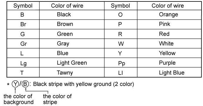 - The following abbreviations are used to identify wire colors in the circuit schematics.