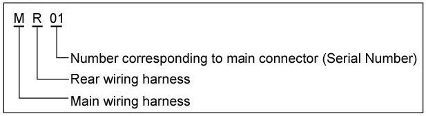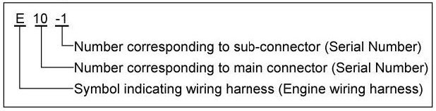 A connector identification symbol consists of a wiring harness location classification symbol corresponding to a wiring harness location and number corresponding to the connector.