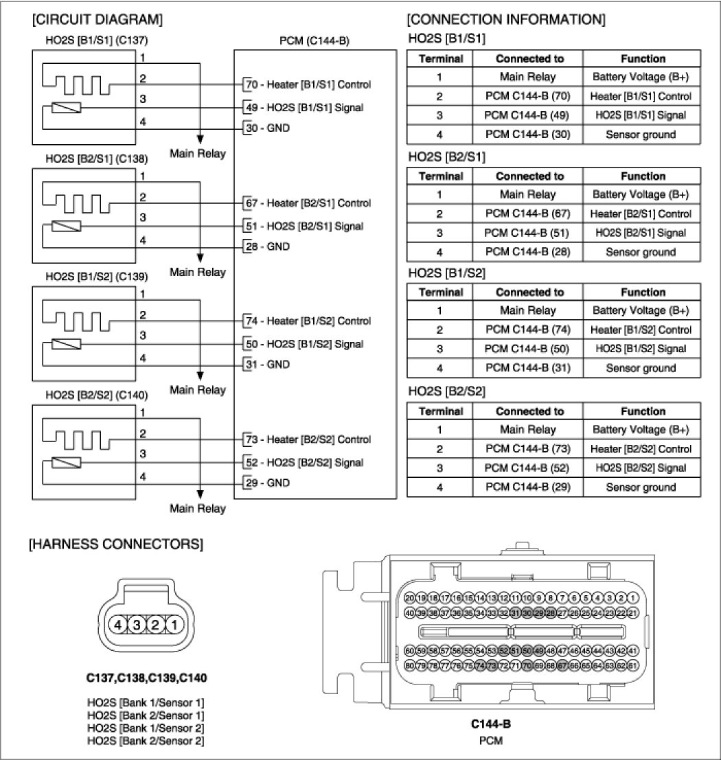 Heated Oxygen Sensor (HO2S) consists of zirconium and alumina and is installed on upstream and downstream of the Manifold Catalyst Converter (MCC). After it compares oxygen consistency of the atmosphere with the exhaust gas, it transfers the oxygen consistency of the exhaust gas to the PCM. When A/F ratio is rich or lean, it generates approximately 1V or 0V respectively. In order that this sensor normally operates, the temperature of the sensor tip is higher than 370°C (698°F). So it has a heater which is controlled by the PCM duty signal. When the exhaust gas temperature is lower than the specified value, the heater warms the sensor tip.
