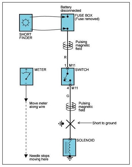 A short finder is available to locate a short to ground. The short finder creates a pulsing magnetic field in the shorted circuit and shows you the location of the short through body trim or sheet metal.