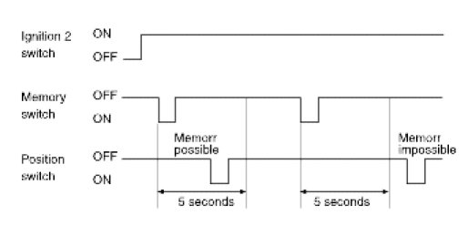 1. If position switch (POS1 or POS2) is pressed within 5 seconds after pressing the memory switch under ignition 2 on, it registers current mirror position. (Switch module sends in LIN communication). (Memory permit status lasts for 5 seconds after memory switch ON. After 5 seconds, memory permits status terminates. In other words, current position is registered if the position switch (POS1 or POS2) is turned on, during the memory permit status). However, RH side mirror position is not registered during the LH side mirror manual switch operation.