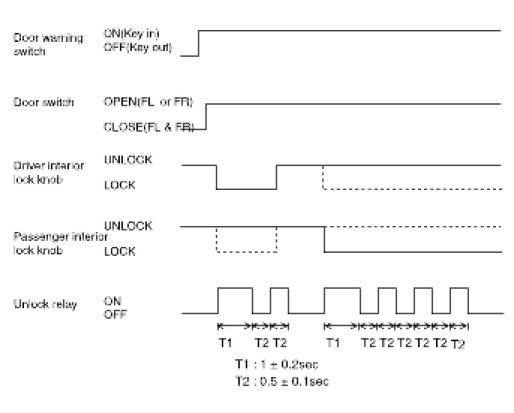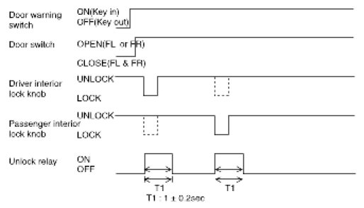1. If the door switch of driver side or passenger side is locked when door warning switch is turned on and (CAN communication reception), driver side or passenger side door is open, it executes unlock output for 1 second. If the passenger side door remains locked even after the unlock output, it repeats on and off 3 times with the time interval of 0.5 second.