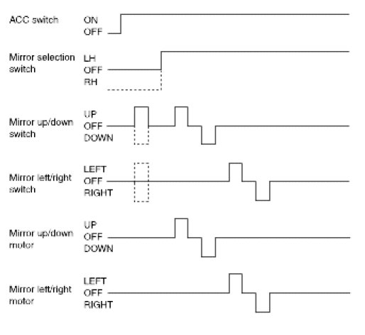 If the mirror direction switch (up, down, left and right) is pressed when mirror selection switch on driver side power window switch is in outside LH under ACC ON condition, then mirror motor moves to the corresponding direction.