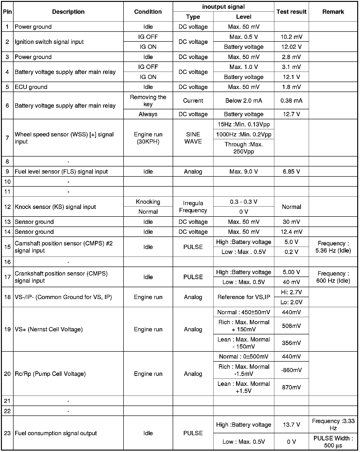 Pinout Values and Diagnostic Parameters