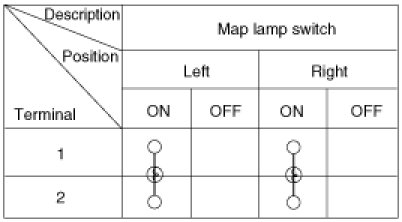 Remove the overhead console lamp assembly then check for continuity between terminals. If the continuity is not as specified, replace the map lamp switch.