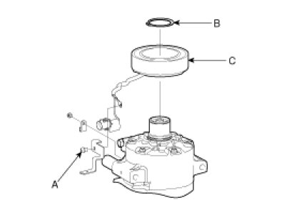 4. Remove the screw (A) from the field coil ground terminal. Remove the retainer ring (B) and then remove the field coil (C) from the shaft with a puller. Be careful not to damage the coil and compressor.
