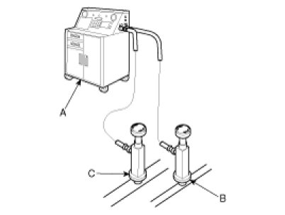 Recovery/Recycling/Charging System (A) to the high-pressure service port (B) and the low-pressure service port (C) as shown, following the equipment manufacturer's instructions.
