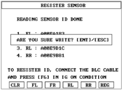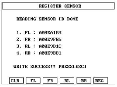 1. Read the four sensor's ids starting with sensor 1 (1 normally front left, 2 front right, 3 rear left, 4 rear right).