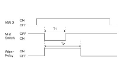 (1) Under "IGN2 SWITCH = ON", WIPER RELAY is turned ON immediately from "Mist SWITCH = ON" if "Mist SWITCH = ON" for T1 , Wiper RELAY is turned OFF after T2.