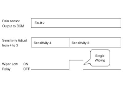 4. The drive may adjust the rain sensor performance by adjusting the sensitivity input. When in automatic mode, the BCM will perform a single wipe each time the sensitivity is adjusted upward to a more sensitive setting (downward more then one step). This single wipe will only be performed if Rain Detected signal is being received from the Rain sensor. If the sensitivity adjustment is adjusted upward more than one sensitivity, the BCM will only perform a single wipe unless the time between Increases is more than 2 seconds.