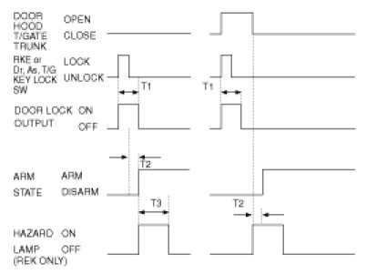 (1) ARM state is released (DISARM state) and the horn, the hazard output and the B/Alarm output shall be OFF, and the unlock output shall be ON for T1, and hazard lamp output shall be ON twice with cycle of T2(RKE only).