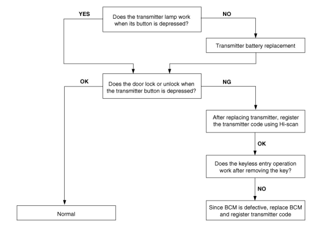 7. Central door lock function works, but keyless entry system does not work.