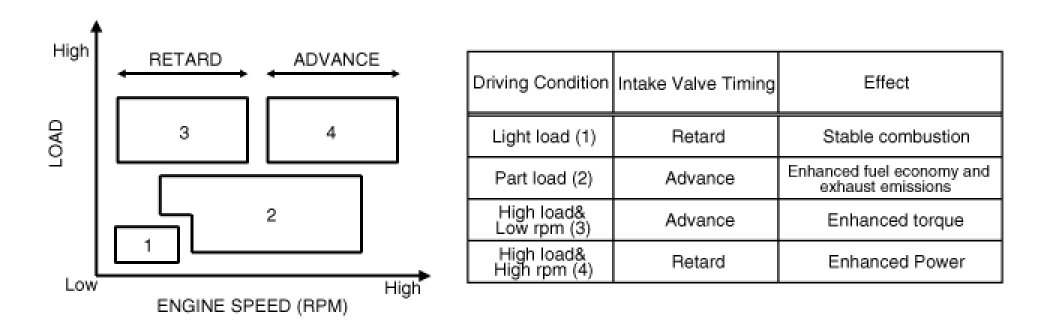 This CVVT system improves fuel efficiency and reduces NOx emissions at all levels of engine speed, vehicle speed, and engine load by EGR effect because of valve over-lap optimization.